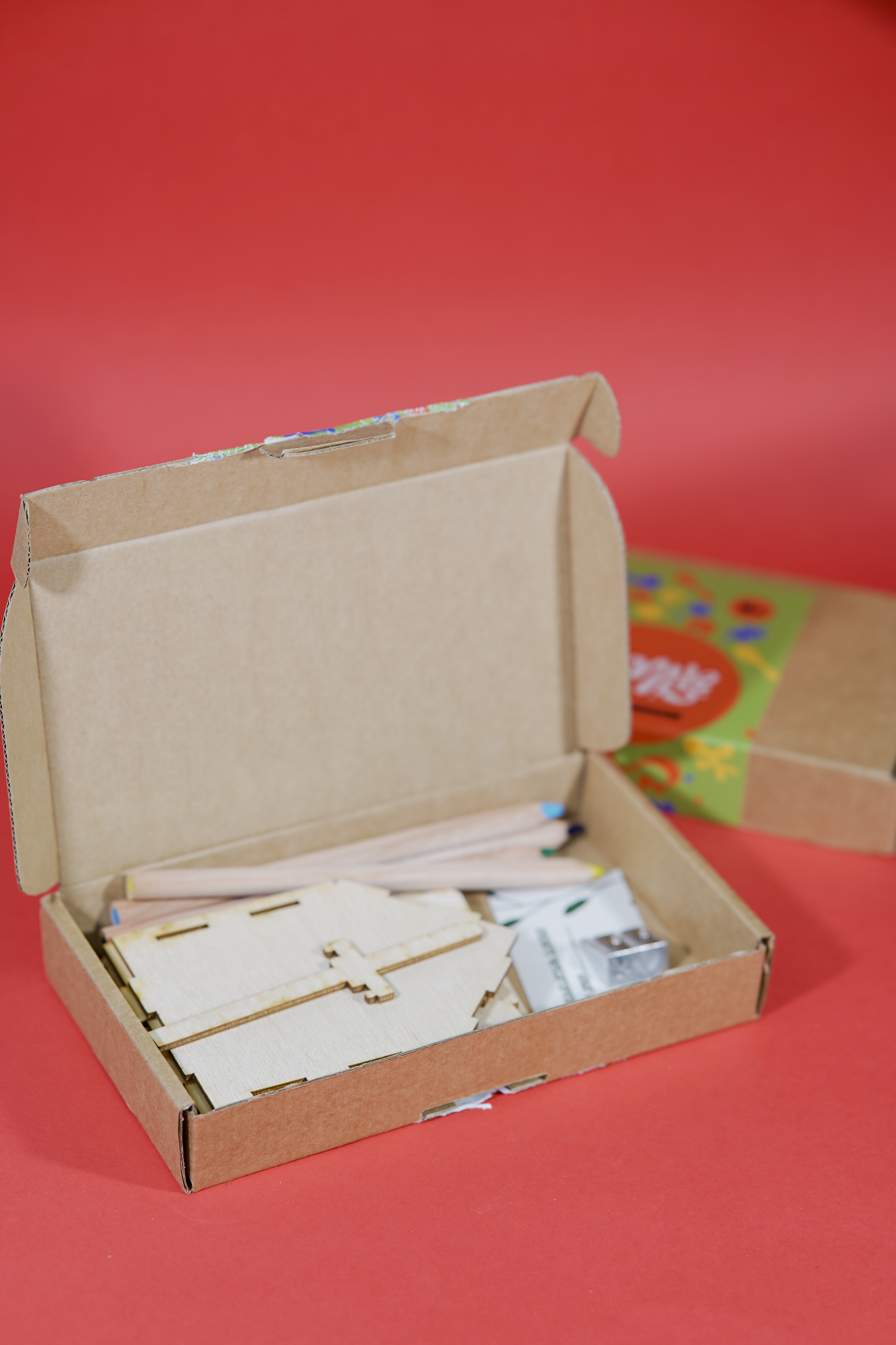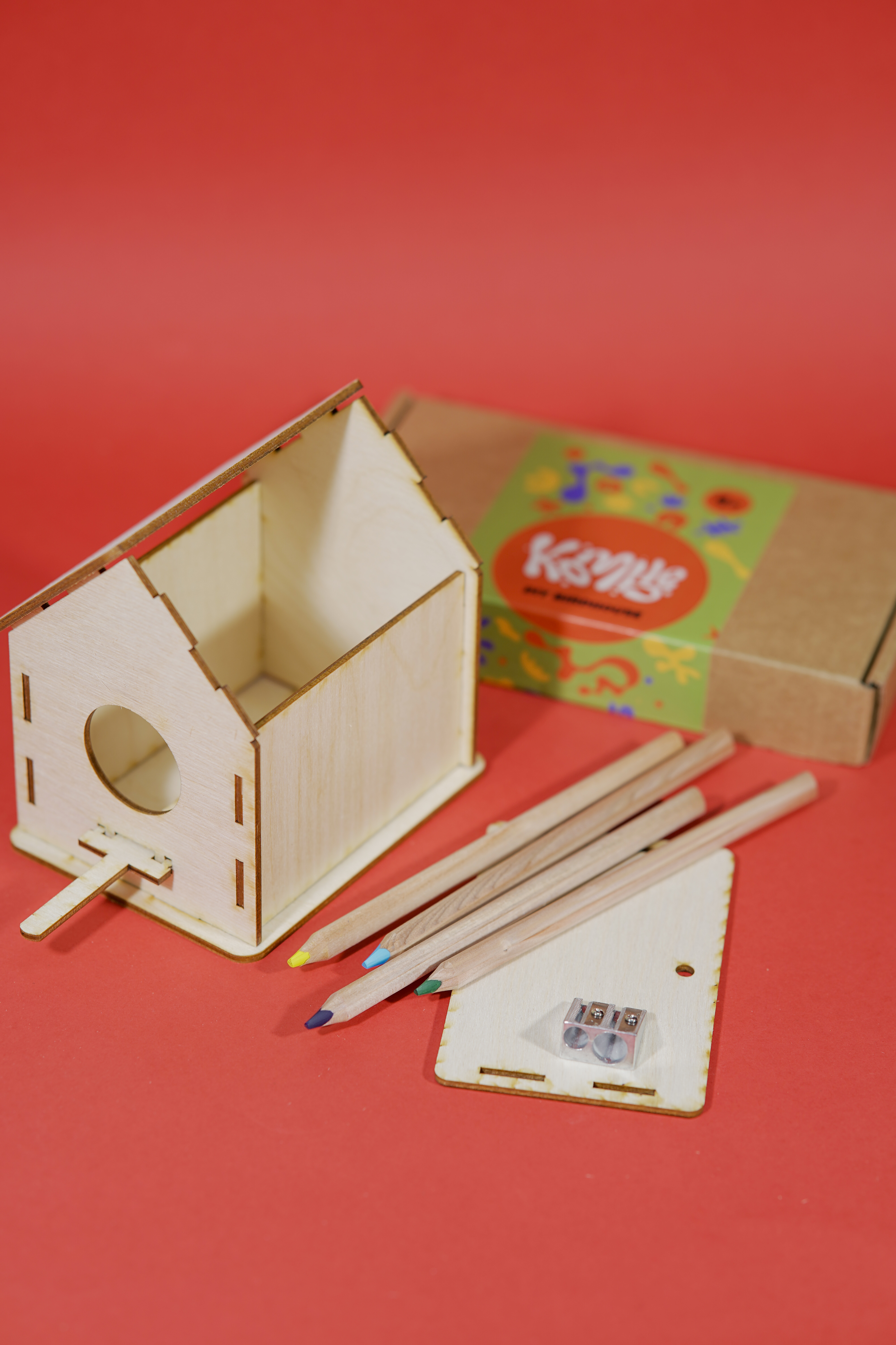 შიგნით იპოვი ხის დეტალებს, ფანქრებს და  ყველაფერს, რაც გჭირდება საკუთარი ჩიტის ბუდის ასაწყობად და მოსახატად.